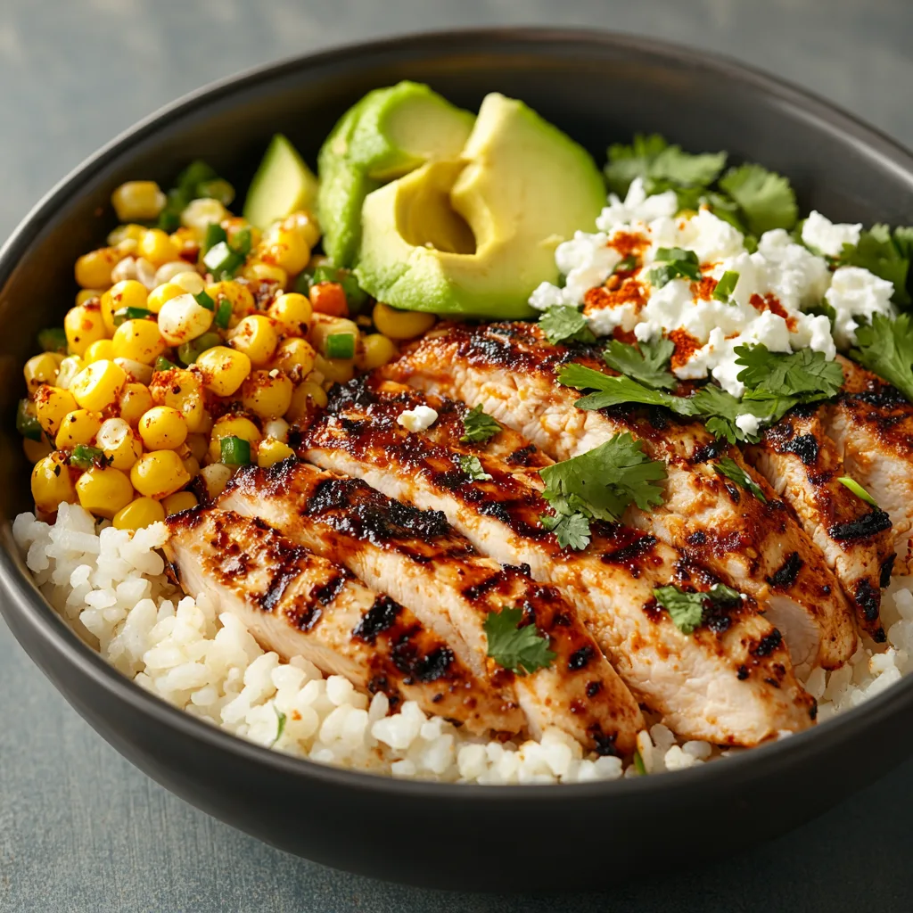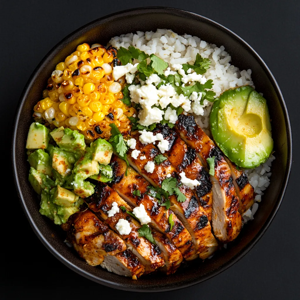 Finally, start by layering the rice as the base, then add the sliced chicken and top with the prepared street corn. Additionally, customize with optional toppings like diced avocado, jalapeños, and a dollop of sour cream or Greek yogurt to enhance texture and creaminess.